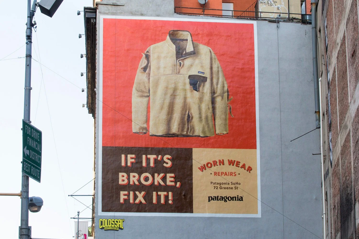 A Patagonia Worn Wear mural in New York, turning a city wall into a manifesto for repair, longevity, and resisting throwaway consumption.