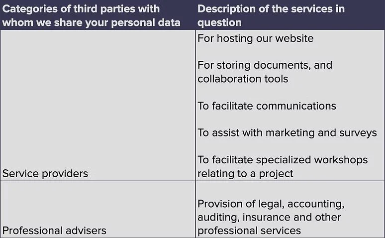 We use third party platforms to facilitate our services (“Service Providers”). Any personal data shared with third parties is limited to what they need to perform their designated functions.