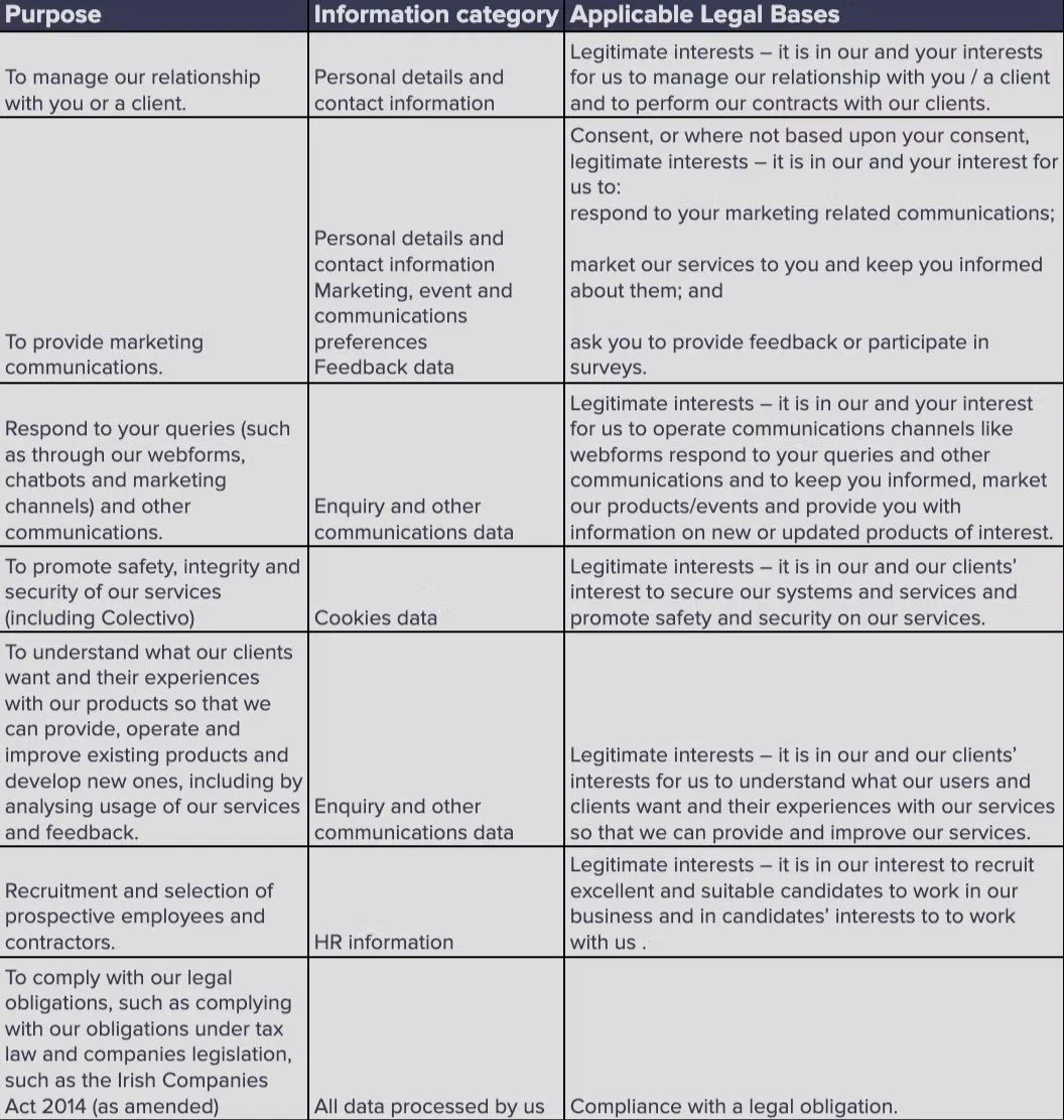 This Privacy Policy describes how Colectivo Limited (“us”, “we”, or “our”) processes your information and the ways that you can manage how your personal data is used, including the right to object to certain types of processing (see Your Rights below for more information on your rights as a data subject).